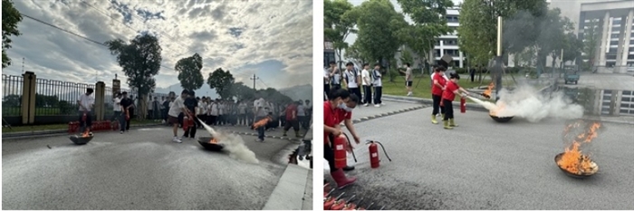 理论讲座结束后,消防员在学院南门空地现场开设“实战课堂”,通过“提、拔、握、压”四字口诀,手把手教授干粉灭火器使用方法。师生代表分组轮番上阵,对准模拟火源按下手柄,条条白色干粉精准覆盖火苗,成功完成灭火任务。